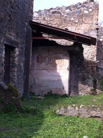 En esta tavernae vemos un fresco de un altar doméstico romano, se pintaba para proteger los hogares o negocios, están representadas dos serpiertes bajo los Lares, o dioses domésticos.
